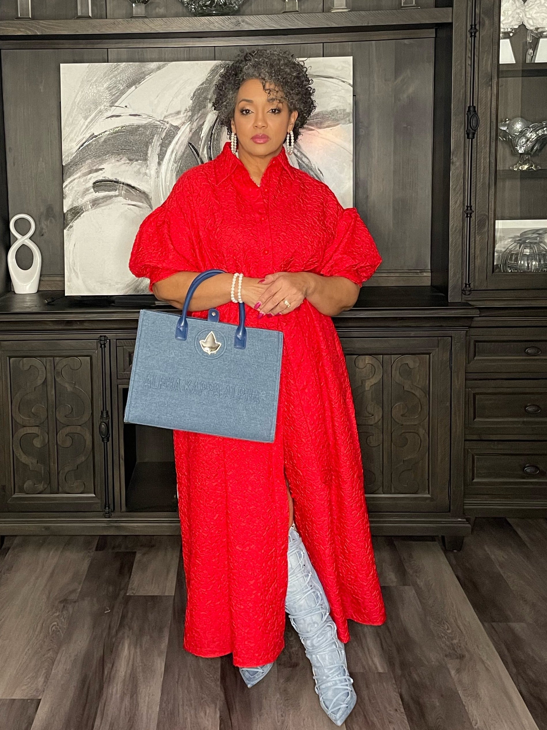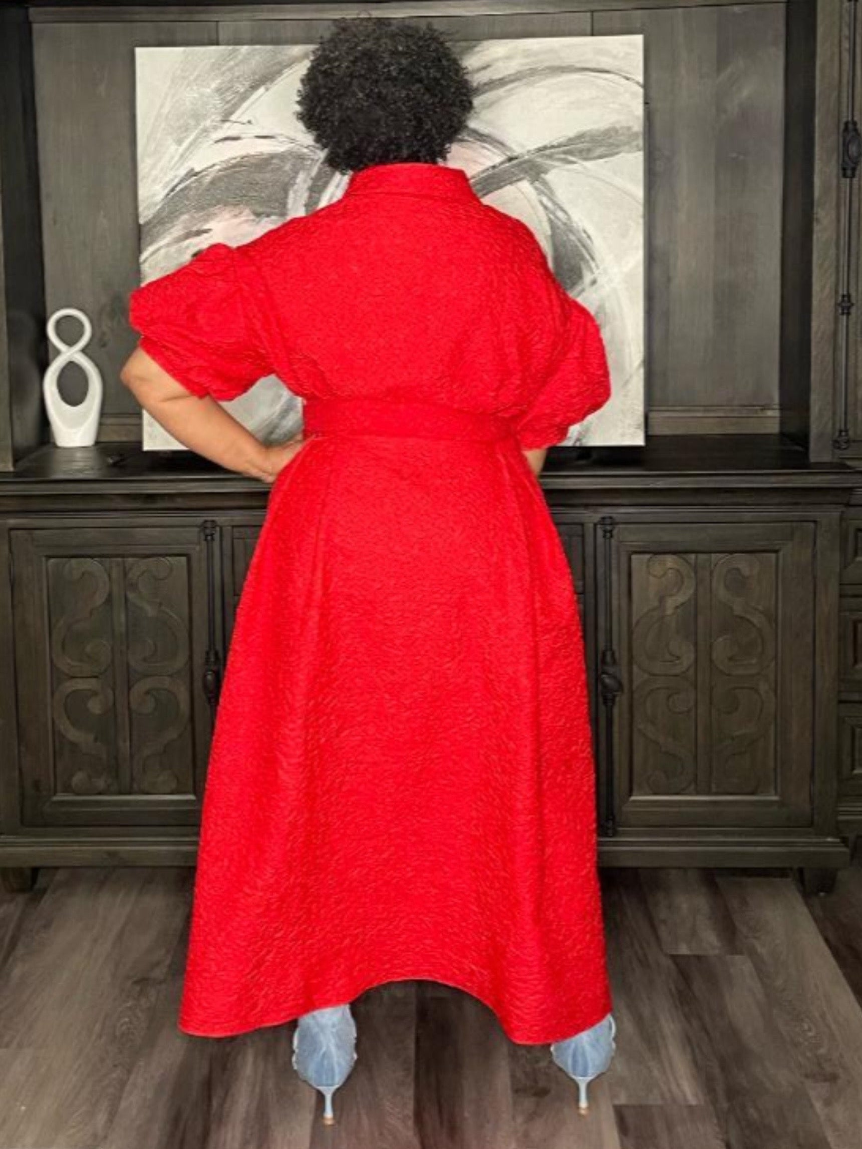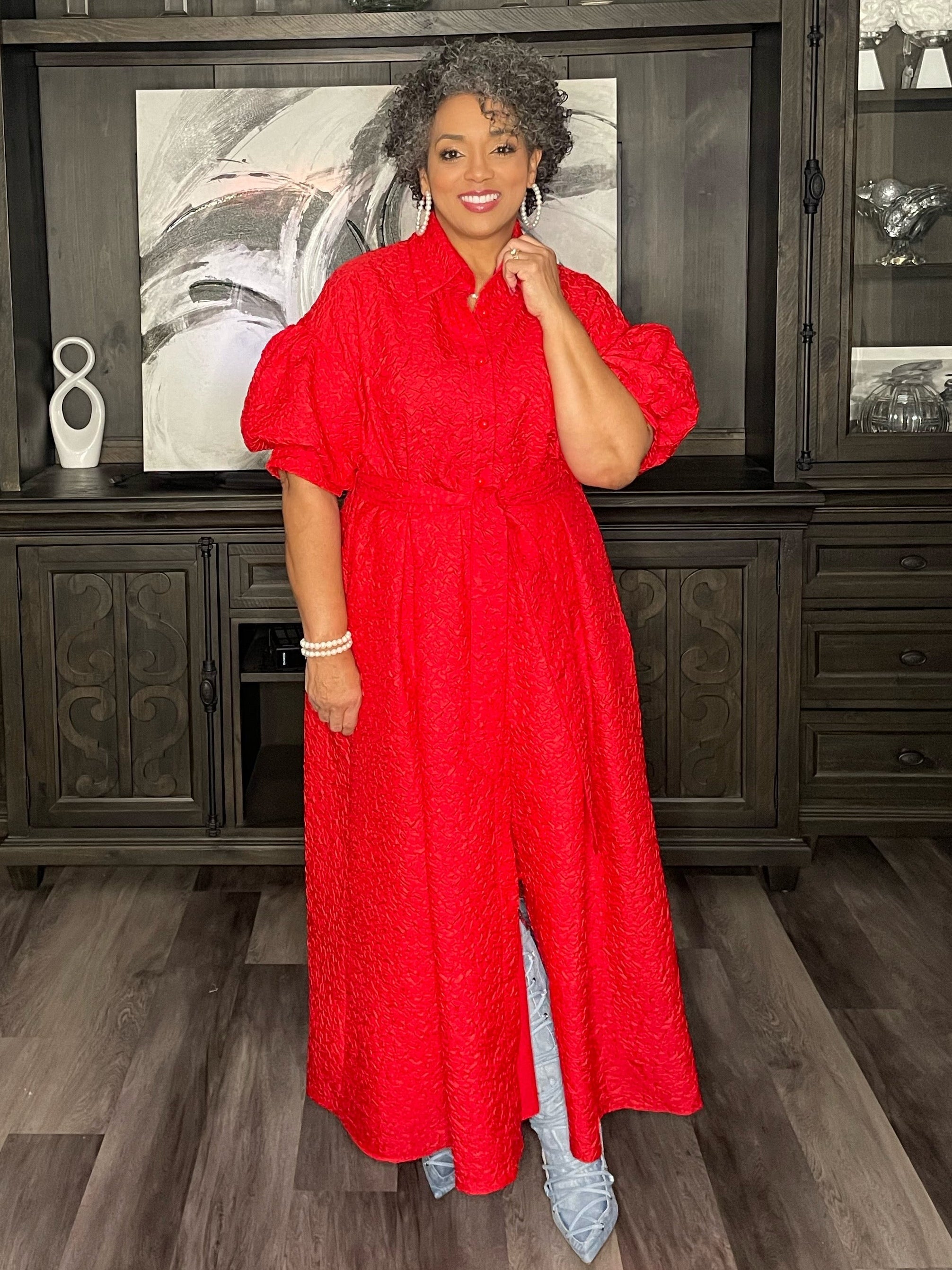 Command attention in this audacious red maxi duster crafted from textured poly-blend fabric. The structured button-down front and cinching wrap belt sculpt a bold, feminine frame, while puffed short sleeves adorned with ruffles add unexpected edge. Fully lined for seamless wear, this fearless piece rewrites the rules wear it as a statement dress or unbutton it as a commanding jacket over denim or pair with thigh-high boots and pure confidence. Perfect for work, worship, or on the town. This Valentine season, be unforgettable.
